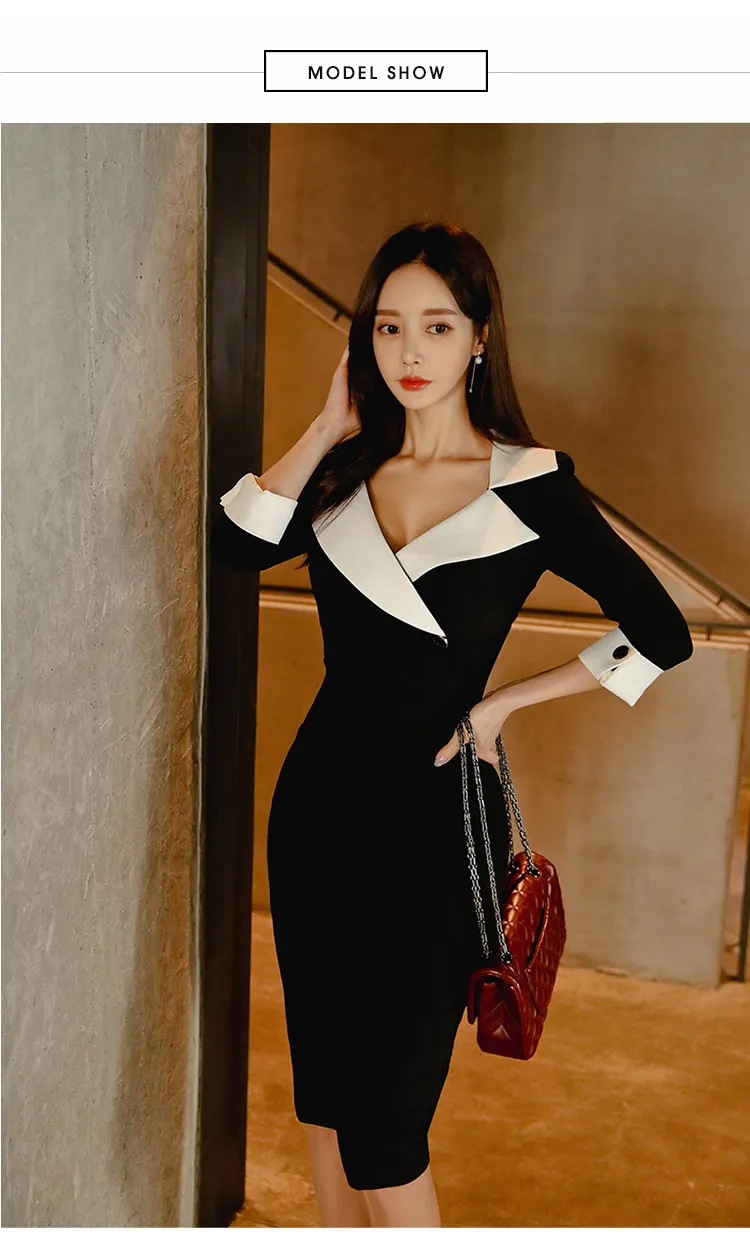 This is a dress with a unique design. It uses a suit collar design, which looks very neat. The color is black and white splicing, which is classic and fashionable. The seven-quarter sleeve design adds a bit of elegance and a certain practicality. At the same time, this dress also has a waist design, which can highlight the wearer's slender waist. The hip wrap style shows the curvature of women.