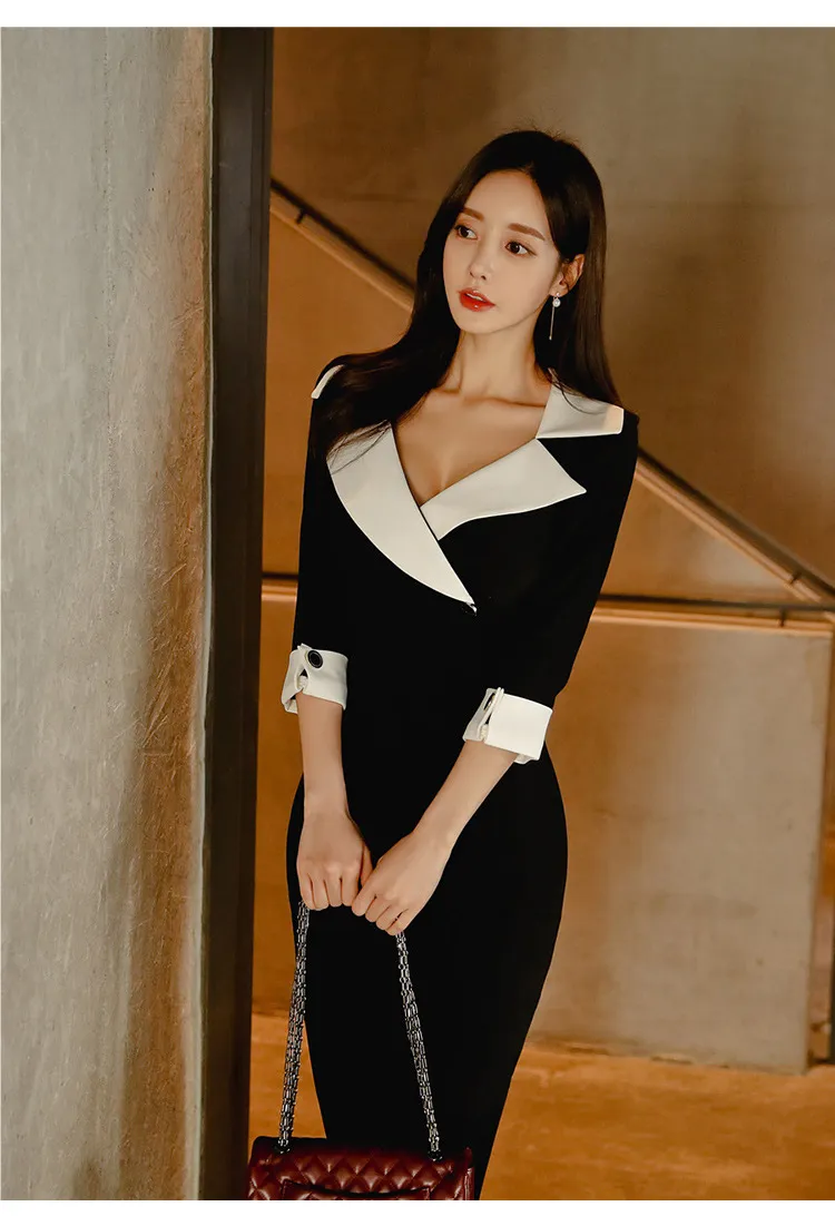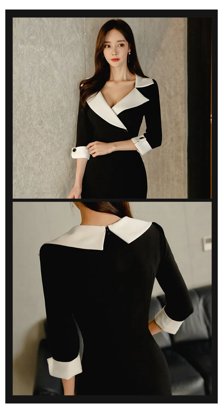 This is a dress with a unique design. It uses a suit collar design, which looks very neat. The color is black and white splicing, which is classic and fashionable. The seven-quarter sleeve design adds a bit of elegance and a certain practicality. At the same time, this dress also has a waist design, which can highlight the wearer's slender waist. The hip wrap style shows the curvature of women.